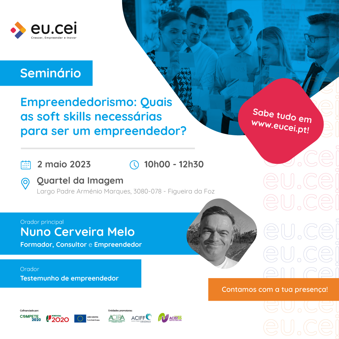 Este seminário vai realizar-se no dia 2 de maio, entre as 10h e as 12h30, na Figueira da Foz, no Quartel da Imagem, com o orador Dr. Nuno Cerveira Melo. O tema apresentado será “Empreendedorismo: Quais as soft skills necessárias para ser um empreendedor?”.