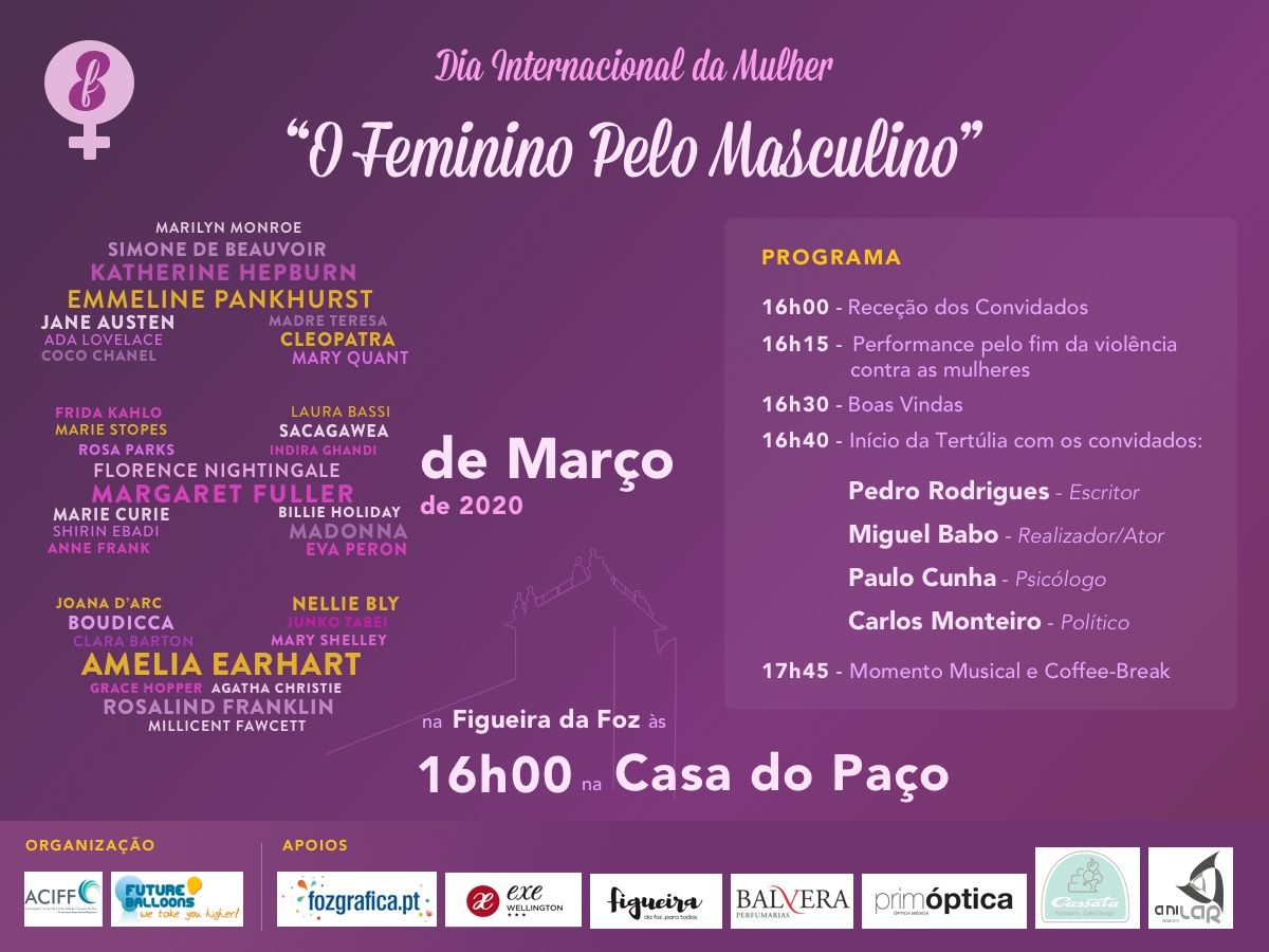 O evento “O Feminino pelo Masculino”, aberto a toda a comunidade figueirense, tem início às 16h00, com uma performance pelo fim da violência contra as mulheres. Segue-se depois a tertúlia e, se em 2019 demos voz a mulheres empreendedoras, em 2020 iremos dar voz aos homens numa reflexão interdisciplinar sobre as mulheres.