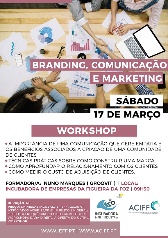 A ACIFF – Associação Comercial e Industrial da Figueira da Foz, Associação Empresarial Regional irá realizar no próximo dia 17 de março, pelas 9h30, nas instalações da IEFF – Incubadora de Empresas da Figueira da Foz, localizado na Zona Industrial da Gala um Workshop dedicado ao tema “Branding, Comunicação e Marketing”