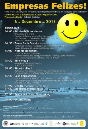 Sob o mote das empresas felizes, realiza-se no próximo dia 6 de Dezembro, no pequeno auditório do CAE - Centro de Artes e Espetáculos da Figueira da Foz, um seminário onde se irá abordar o tema da felicidade em torno das organizações e a forma como se pode dinamizar este tema nas empresas.